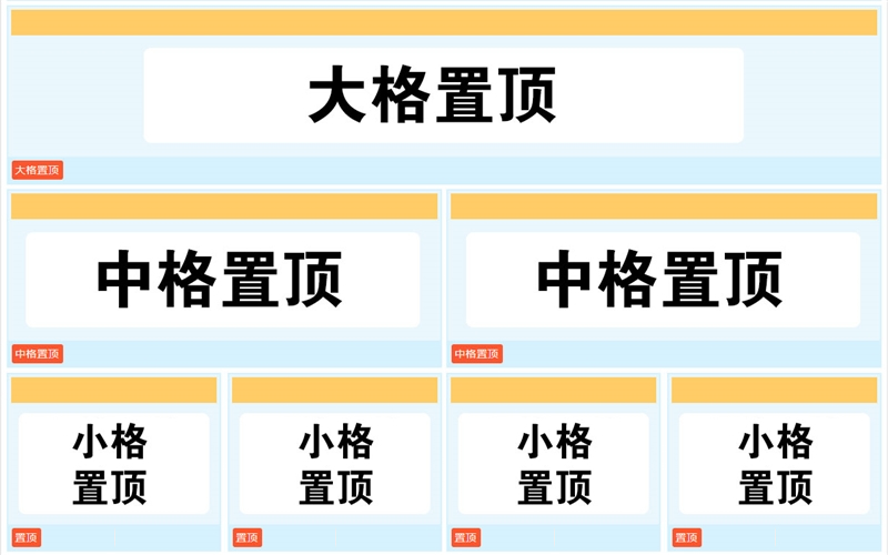大格置顶在前,小格置顶在后。相同大小的置顶信息,先做的在前,后做的在后。