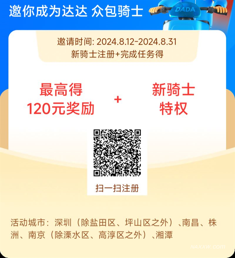 宁安达达招聘专职兼职配送员数名:要求有健康证,年满十八周岁,最好自己有电瓶车,没有也可以提供租车!跑越多拿越多,兼职3000~5000元,全职6000-10000元。扫码注册即可!时间自由,想送就送。